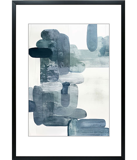 :Abstract print on paper in varied blue watercolor shades finished with a grey charcoal frame.