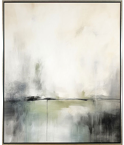 :Abstract giclee on canvas in muted tones with a soft dripping paint effect. Image is finished in a champagne floater frame.