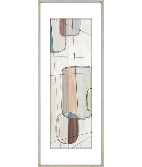:Abstract print on paper in a bold pattern with a raised mat and finished in a wood grain frame.